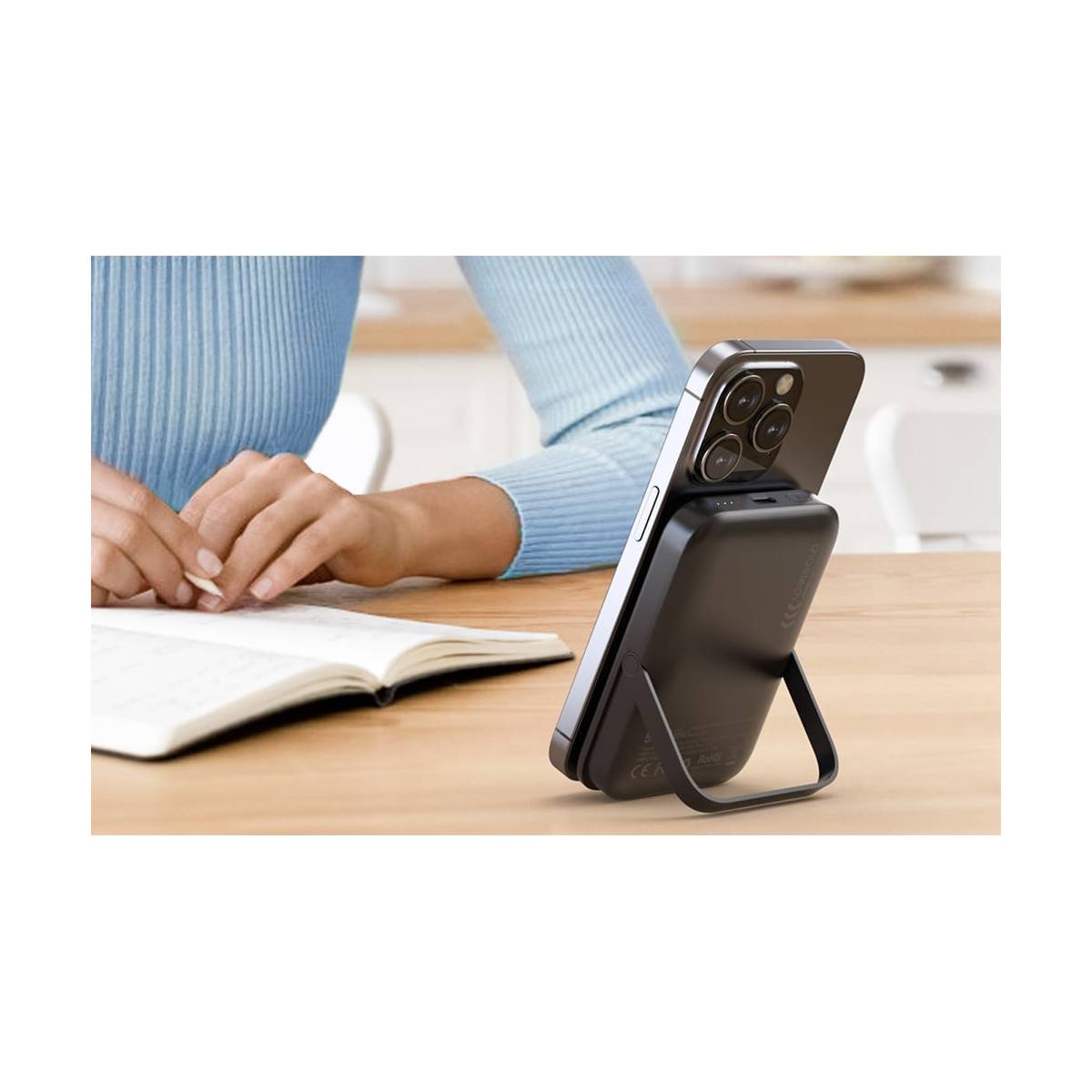 En af de mest bemærkelsesværdige funktioner ved denne powerbank er det indbyggede stativ. Dette gør det muligt at sætte din telefon op på bordet, mens den oplader. Dette er perfekt til videoopkald, opskrifter i køkkenet eller en serie i sofaen, uden at du skal balancere mobilen op ad en kaffekop.