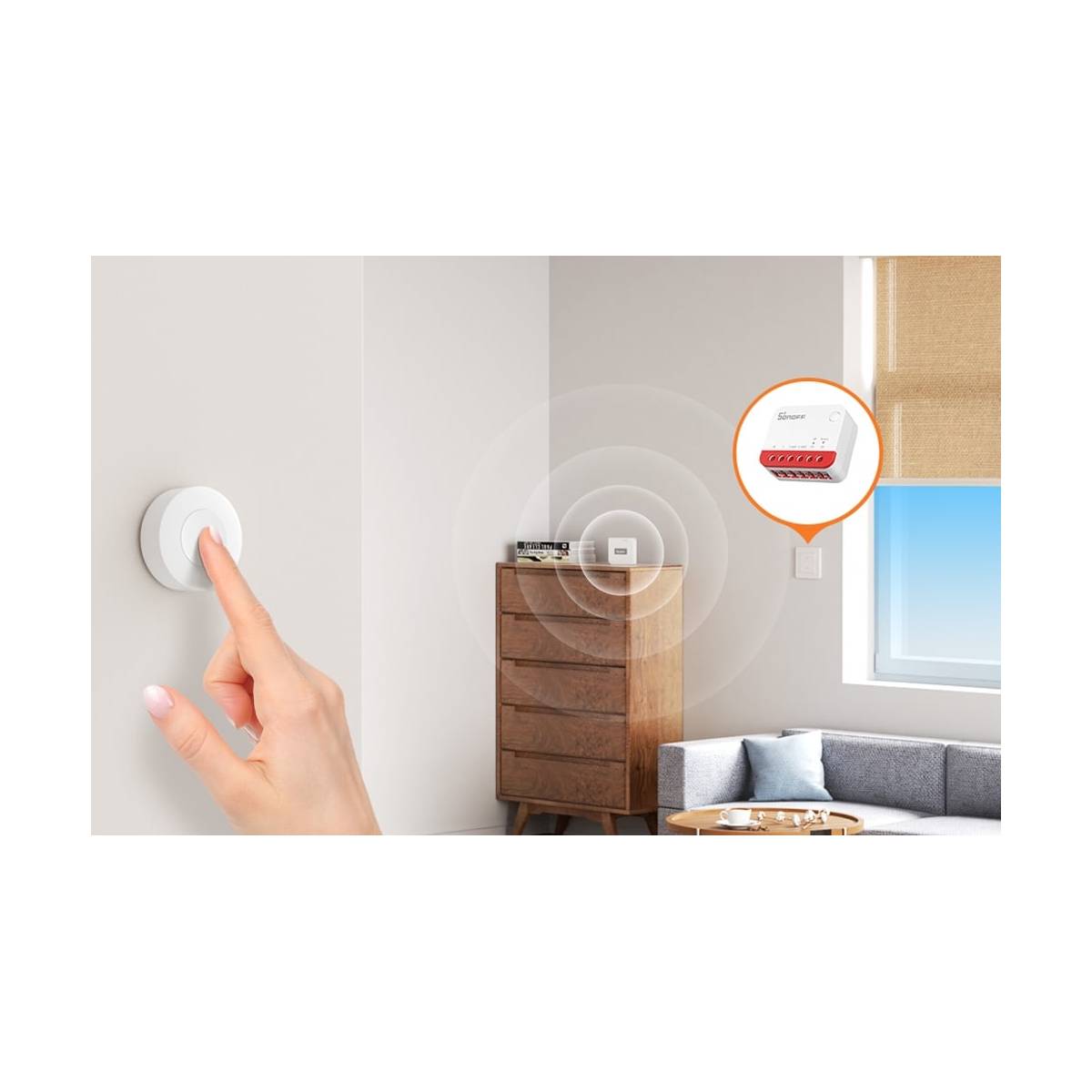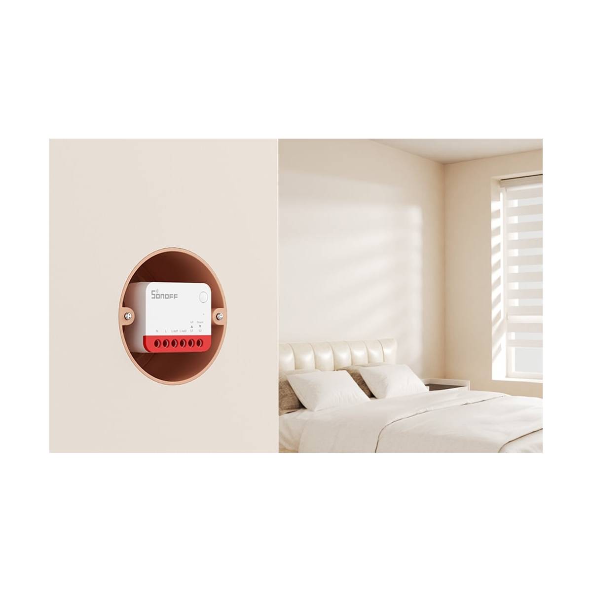 Sonoff MINI-ZBRBS kører på 100–240 v AC og er beregnet til indendørs brug. Den kan nemt placeres bag en eksisterende afbryder, så du både kan styre den fra en app og stadig bruge den manuelle kontakt i hverdagen.