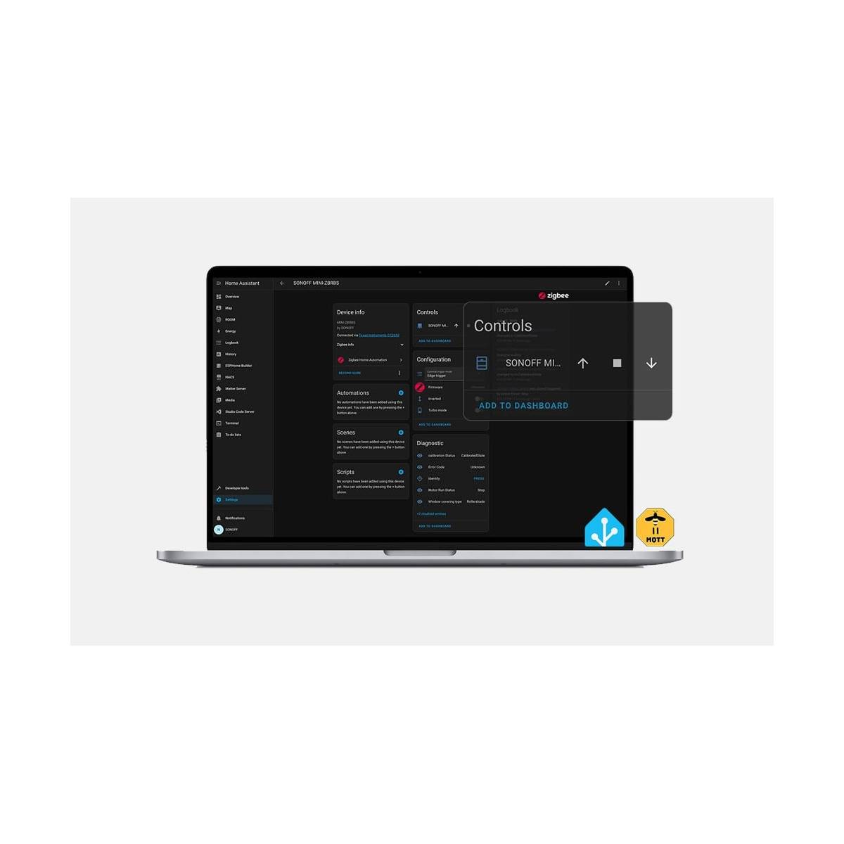 Sonoff MINI-ZBRBS er kompatibel med Home Assistant via ZHA og Zigbee2mqtt, hvilket giver dig mulighed for at samle styringen ét sted. Dette åbner op for smarte scenarier på tværs af dit hjem, som at sænke alle rullegardiner ved sengetid eller lade soveværelset åbne først, mens resten af huset venter.